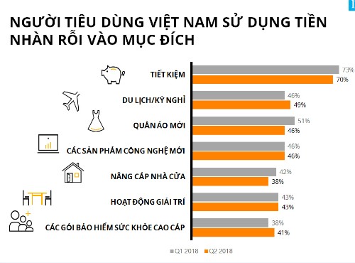 Người tiêu dùng Việt Nam tiếp tục lạc quan về tình trạng tài chính cá nhân của mình, với 76% số người tham gia khảo sát cho định rằng tình trạng tài chính cá nhân của họ tốt hoặc tốt hơn nhiều trong 12 tháng tới, nhưng gần một nửa số người được hỏi cho rằng đây không phải là thời điểm tốt để mua sắm chi tiêu.