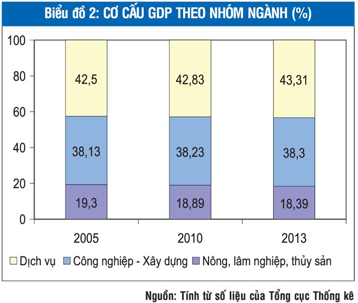 Nhờ có tốc độ tăng cao hơn, nên tỷ trọng GDP do nhóm ngành dịch vụ tạo ra trong tổng GDP cao hơn và liên tục cao nhất trong 3 nhóm ngành.