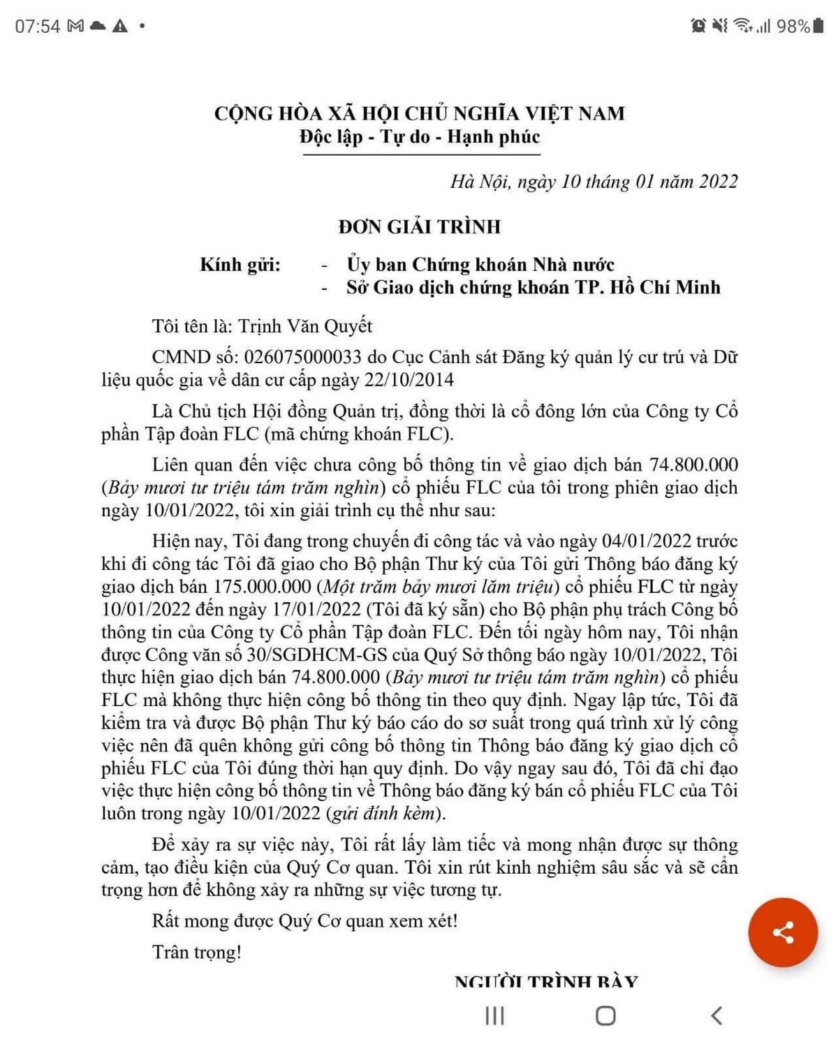Chiều ngày 10/01/2022 (17 giờ 45 phút), Ủy ban Chứng khoán Nhà nước (UBCKNN) nhận được Báo cáo số 31/SGDHCM-GS đề ngày 10/01/2022 của Sở Giao dịch chứng khoán TP. Hồ Chí Minh (HOSE) về việc ông Trịnh Văn Quyết, Chủ tịch Hội đồng Quản trị Công ty cổ phần Tập đoàn FLC giao dịch bán 74,8 triệu cổ phiếu Công ty cổ phần Tập đoàn FLC (Mã chứng khoán FLC - HOSE) nhưng không báo cáo, không công bố thông tin trước khi thực hiện giao dịch.