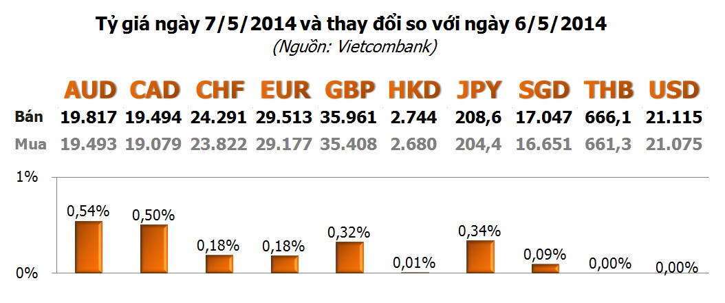 Các ngoại tệ khác đồng loạt tăng giá, tuy mức tăng không quá lớn. Dẫn đầu là AUD với 0,54%; tiếp đến là CAD với 0,50%; JPY với 0,34% và GBP với 0,32%...