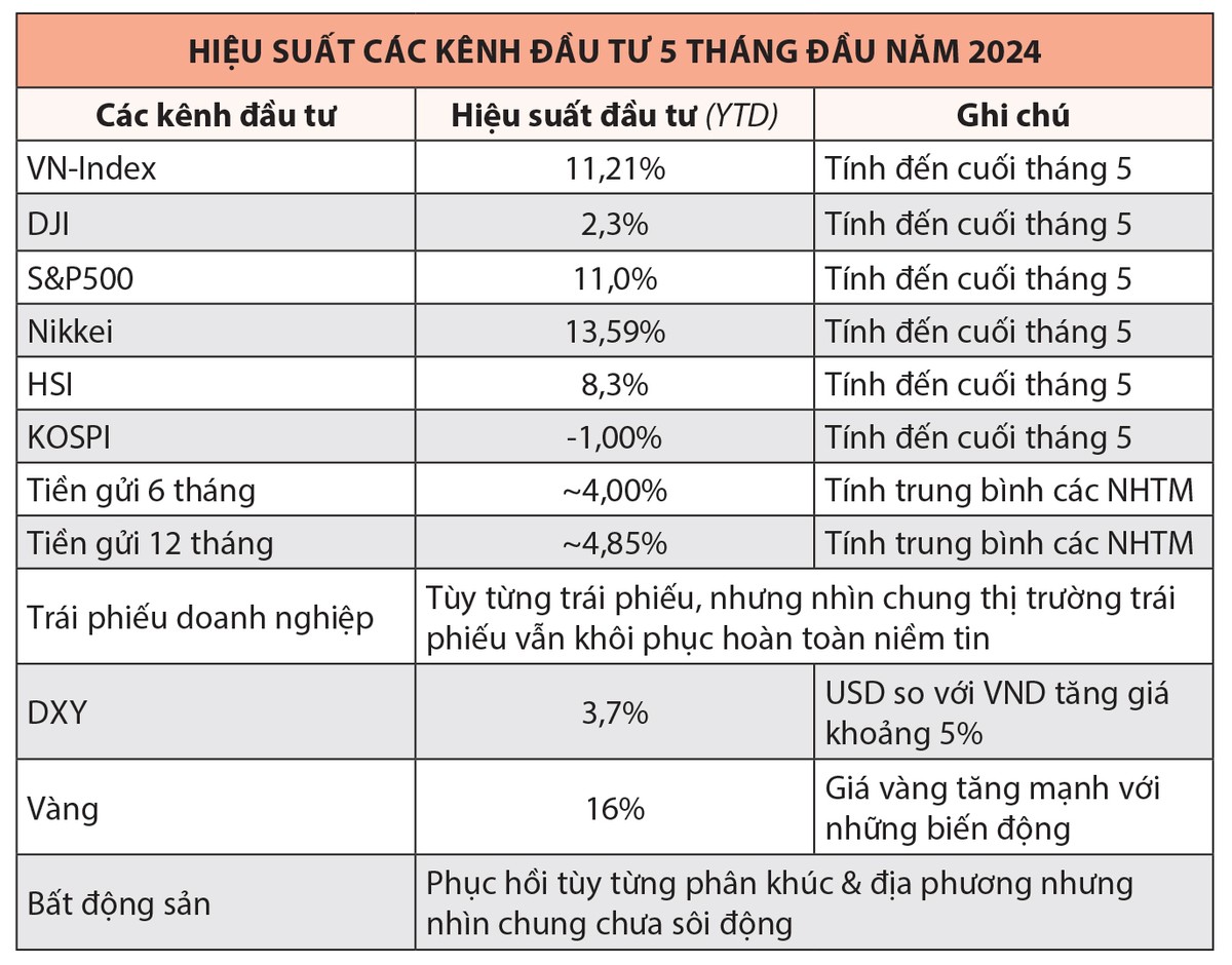 Lãi suất tiết kiệm đang có xu hướng nhích dần lên, nhưng vẫn ở mức khá thấp trong nhiều năm. Thị trường trái phiếu doanh nghiệp còn ít sự lựa chọn và chưa sôi động. Tỷ giá USD/VND tăng khoảng 5% từ đầu năm nhưng khả năng sẽ hạ nhiệt khi Fed hạ lãi suất. Giá vàng năm nay khá tích cực trước những biến động địa chính trị, nhưng không hấp dẫn trong dài hạn. Bất động sản phục hồi tùy từng phân khúc và địa phương, nhưng nhìn chung chưa sôi động. Chứng khoán vẫn là sự lựa chọn khá hấp dẫn từ nay đến cuối năm nhờ các yếu tố: thị trường chứng khoán thế giới diễn biến khá tốt trong năm bầu cử Tổng thống Mỹ; xu hướng hạ lãi suất của nhiều ngân hàng trung ương lớn; sự phục hồi kinh tế trong nước ngày càng vững chắc, nhất là tiêu dùng; nền lãi suất có nhích tăng nhưng vẫn nằm ở vùng thấp nhất trong nhiều năm qua và triển vọng nâng hạng thị trường.