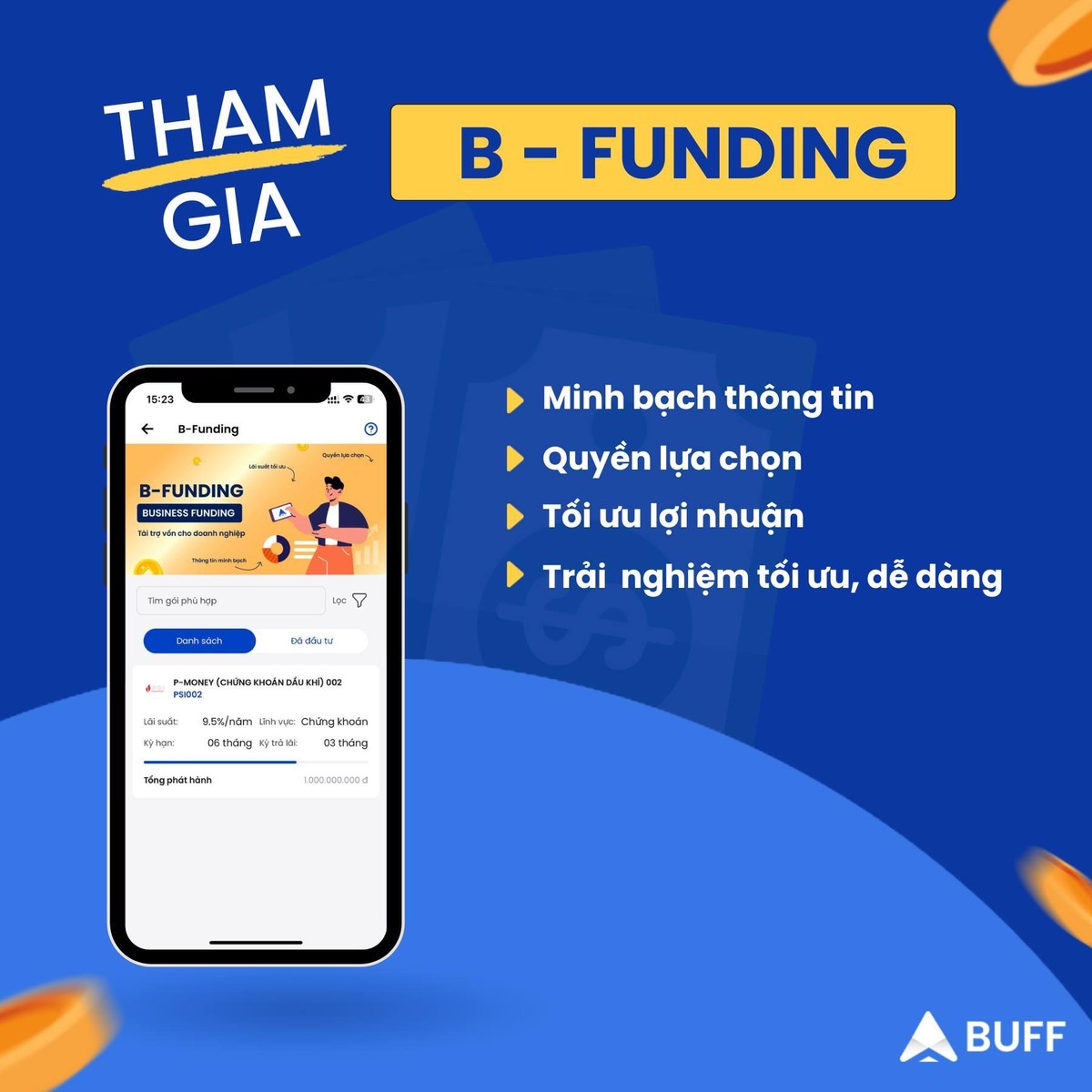 Theo thông tin quảng bá từ Buff, sản phẩm B-Funding (Business Funding) là sản phẩm hưởng thu nhập cố định độc quyền chỉ có tại BUFF, vừa ra mắt ngày 25/11/2022. Sản phẩm giúp nhà đầu tư tài trợ vốn cho các doanh nghiệp để phục vụ hoạt động sản xuất, kinh doanh, đầu tư, tái cơ cấu nguồn vốn.