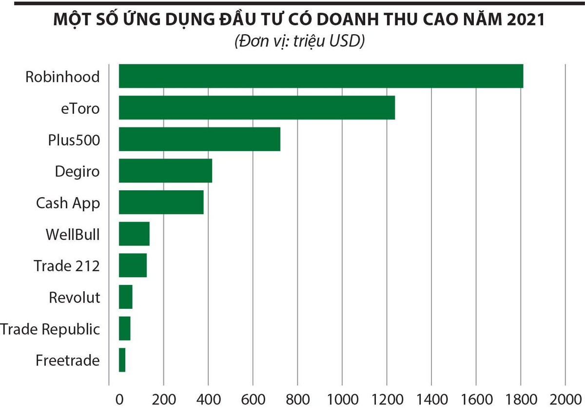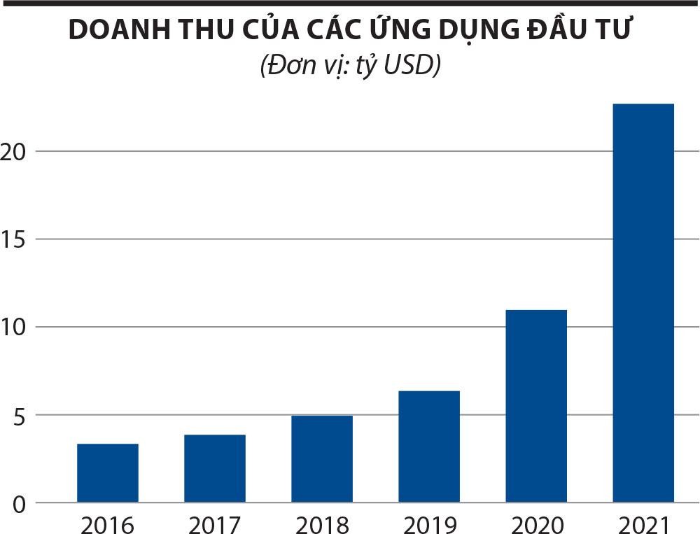 Theo Business of Apps, số lượng người dùng các ứng dụng đầu tư trong năm 2021 đạt hơn 130 triệu người, tăng 49% so với năm trước đó. Các ứng dụng đầu tư đã tạo ra doanh thu 22,8 tỷ USD năm 2021, trong đó, Robinhood là ứng dụng nổi bật nhất.