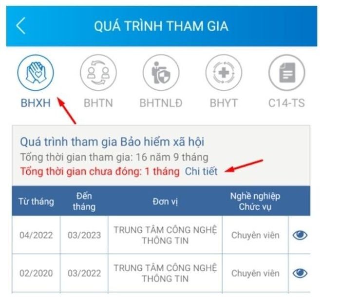 Bước 2. Tại màn hình QUÁ TRÌNH THAM GIA, chọn "BHXH" để xem tổng thời gian tham gia và tổng thời gian chưa đóng BHXH.
