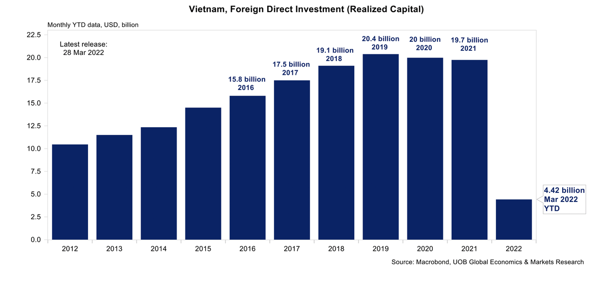 Rủi ro trên dòng vốn đầu tư nước ngoài tại Việt Nam đã tăng lên trong thời gian gần đây do kỳ vọng tăng lãi suất mạnh mẽ của Cục Dự trữ Liên bang Hoa Kỳ. UOB dự báo, Cục Dự trữ Liên bang Hoa Kỳ sẽ tăng lãi suất tại mỗi cuộc họp trong số sáu cuộc họp FOMC còn lại cho năm 2022, đưa lãi suất cơ bản của USD lên khoảng 1,75 - 2,00% vào cuối năm 2022.