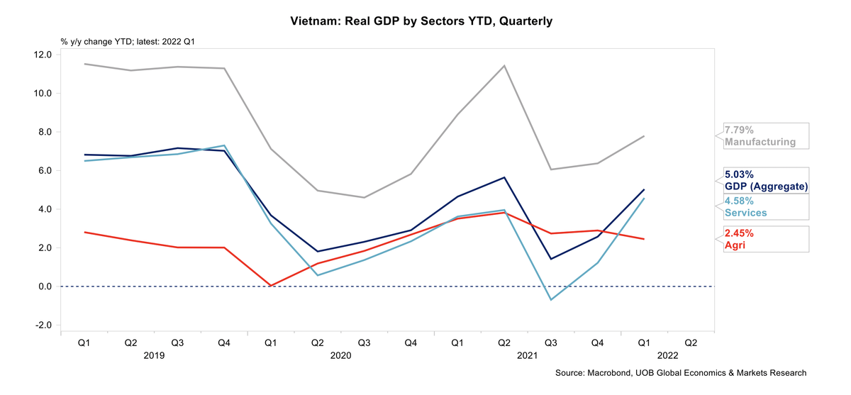 Tăng trưởng ổn định trong quý I/2022 được hỗ trợ nhờ vào kết quả hoạt động tốt từ lĩnh vực sản xuất, trong khi lĩnh vực dịch vụ dần phục hồi sau khi nhiều khu vực của nền kinh tế được mở cửa trở lại khi chính phủ nới lỏng các hạn chế phòng dịch COVID-19. Tuy nhiên, mức tăng trưởng thấp hơn kỳ vọng của UOB là 5,8%.