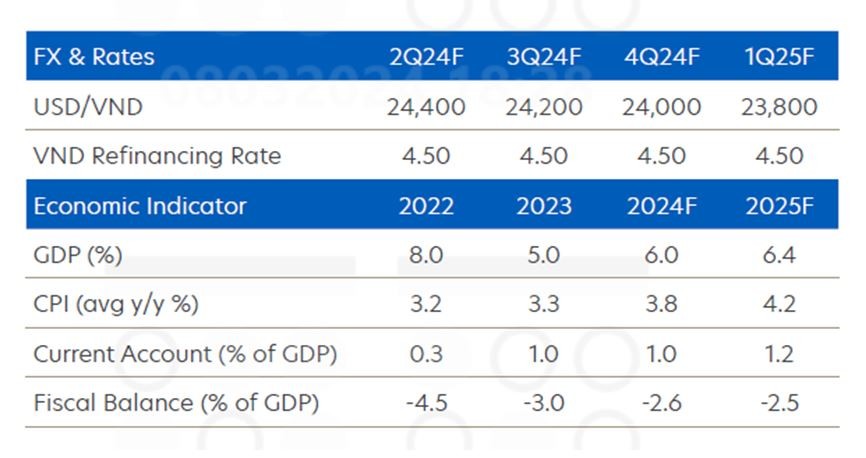 “Dự báo cập nhật về USD/VND của chúng tôi là 24.400 trong quý II/2024, 24.200 trong quý III/2024, 24.000 trong quý IV/2024 và 23.800 trong quý I/2025”, các chuyên gia kinh tế UOB nhận định.