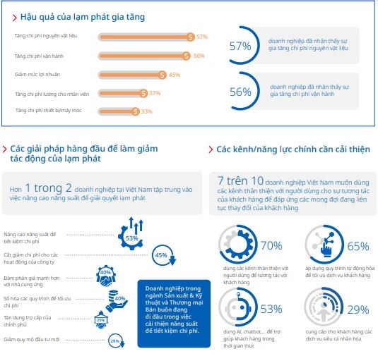Nghiên cứu cho thấy, 57% doanh nghiệp được khảo sát chịu ảnh hưởng từ chi phí nguyên vật liệu tăng và 56% doanh nghiệp chịu ảnh hưởng từ chi phí hoạt động tăng. Để giảm thiểu tác động của lạm phát, cứ 2 doanh nghiệp tại Việt Nam thì có hơn 1 doanh nghiệp chú trọng nâng cao năng suất và 45% doanh nghiệp được khảo sát cho biết họ áp dụng cắt giảm chi phí trong các hoạt động của công ty.