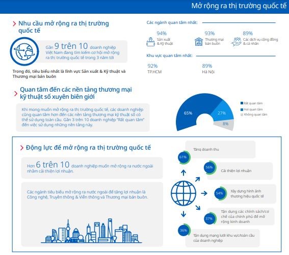 Theo UOB, gần 9 trong 10 doanh nghiệp tại Việt Nam đang tìm cách mở rộng sang thị trường nước ngoài trong 3 năm tới. Nhu cầu mở rộng ra nước ngoài đang dẫn đến sự quan tâm cao hơn đối với các nền tảng thương mại kỹ thuật số xuyên biên giới. Cứ 10 doanh nghiệp thì có hơn 6 doanh nghiệp tỏ ra 'rất quan tâm' đến việc sử dụng các nền tảng như vậy.