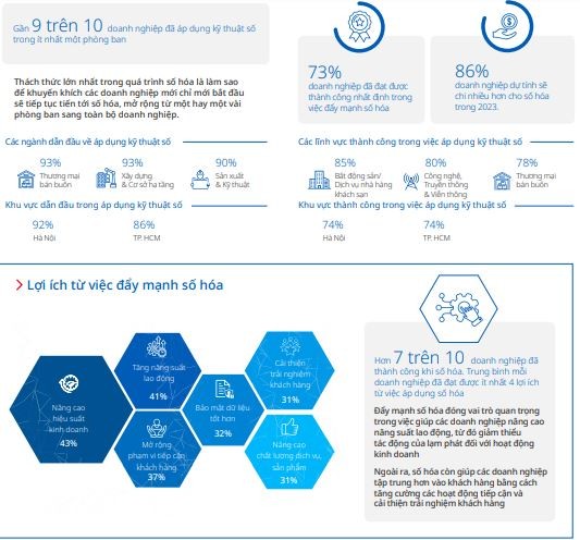 Nghiên cứu cho thấy, cứ 10 doanh nghiệp ở Việt Nam thì có gần 9 doanh nghiệp đã áp dụng số hóa ở ít nhất một bộ phận. 86% doanh nghiệp dự tính sẽ chi nhiều hơn cho số hóa trong năm 2023.