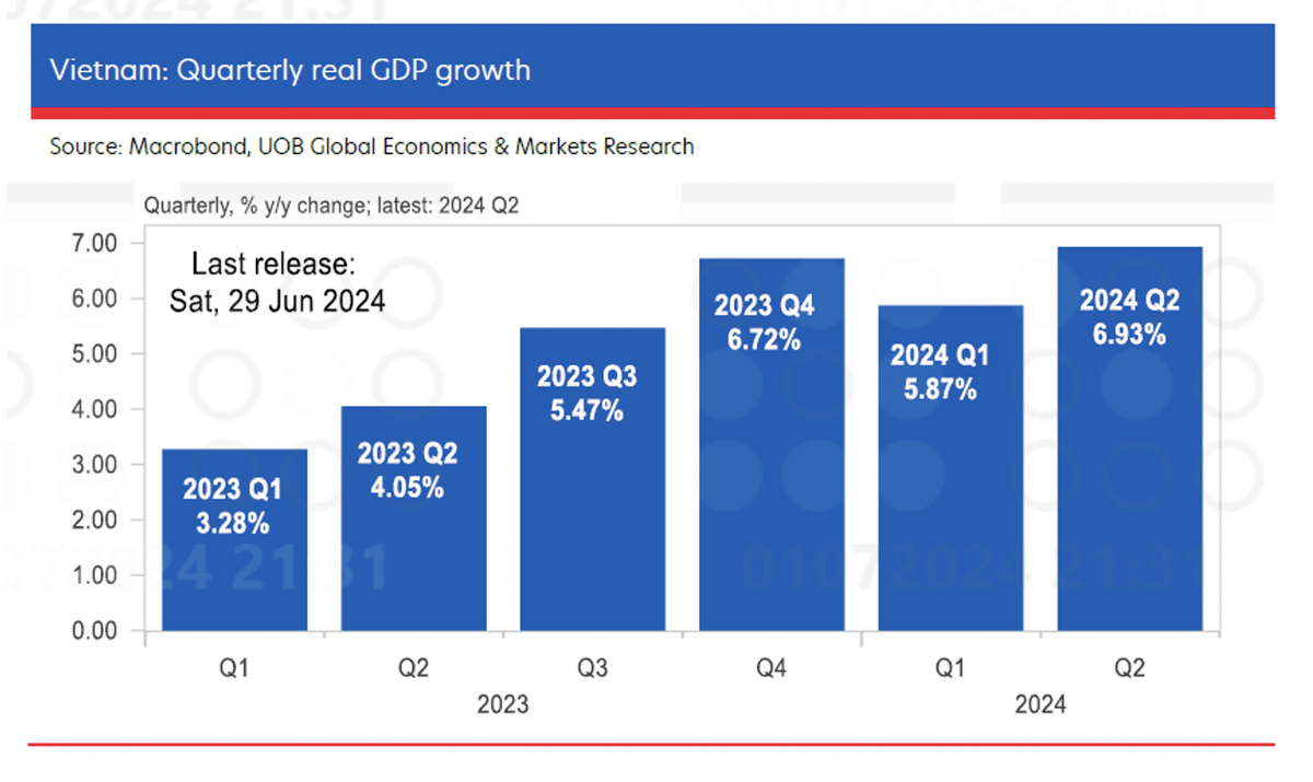 Dữ liệu do Tổng cục Thống kê (GSO) công bố vào ngày 29/6/2024 cho thấy, GDP thực tế của Việt Nam tăng 6,93% so với cùng kỳ trong quý II/2024, tiếp nối đà tăng từ mức 5,87% so với cùng kỳ (đã được điều chỉnh tăng so với công bố trước đó) trong quý I/2024 và mức tăng 6,72% so với cùng kỳ trong quý IV/2023, vượt qua mức tăng 4,05% trong cùng quý vào năm 2023.