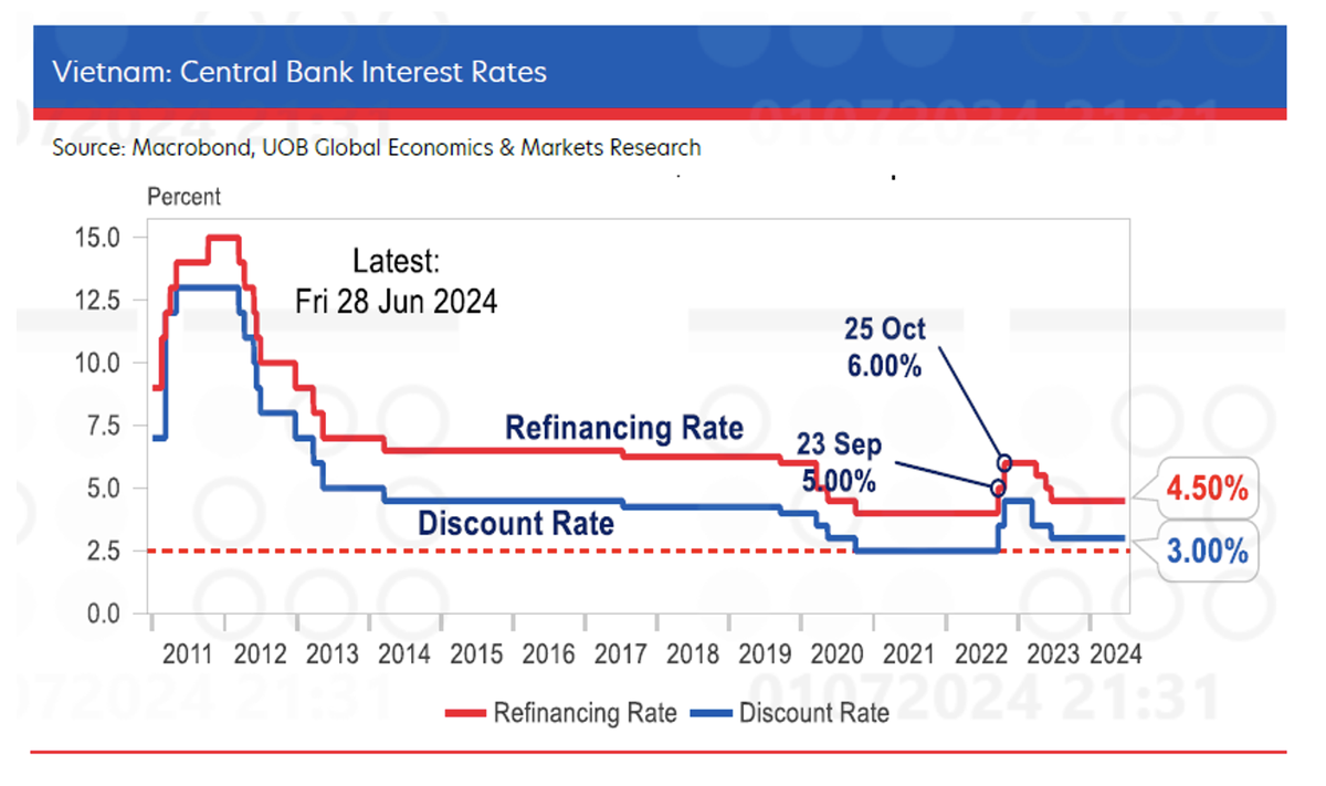 Sự mất giá gần đây của VND trước đồng USD mạnh lên và tỷ lệ lạm phát gia tăng, theo UOB, có thể khiến Ngân hàng Nhà nước Việt Nam (NHNN) thận trọng trong mọi thay đổi về lãi suất chính sách. Với lưu ý rằng đà tăng trưởng hiện tại có thể sẽ giảm bớt trong nửa cuối năm 2024, các chuyên gia của UOB tin rằng, NHNN sẽ duy trì lãi suất tái cấp vốn ở mức hiện tại là 4,50%.