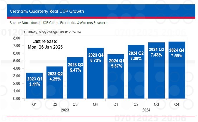 UOB nhận định, Việt Nam đã kết thúc năm 2024 rất thành công với tăng trưởng GDP thực tế quý IV/2024 đạt 7,55%, từ mức 7,43% đã điều chỉnh trong quý III/2024. Con số này cao hơn nhiều so với mức dự báo chung của thị trường là 6,7% và dự báo của UOB là 5,2%. Động lực tăng trưởng được khẳng định rõ khi GDP toàn phần của Việt Nam đã ghi nhận mức tăng trưởng trong 3 quý liên tiếp kể từ lần phục hồi vào quý III/2022 từ vùng đáy của giai đoạn hậu COVID.