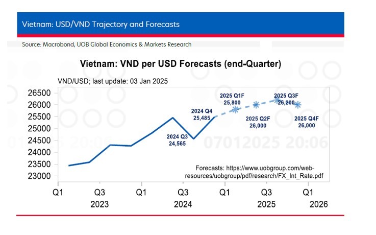 UOB dự báo tỷ giá USD/VND ở mức 25.800 trong quý I, 26.000 trong quý II, 26.200 trong quý III và 26.000 trong quý IV/2025.