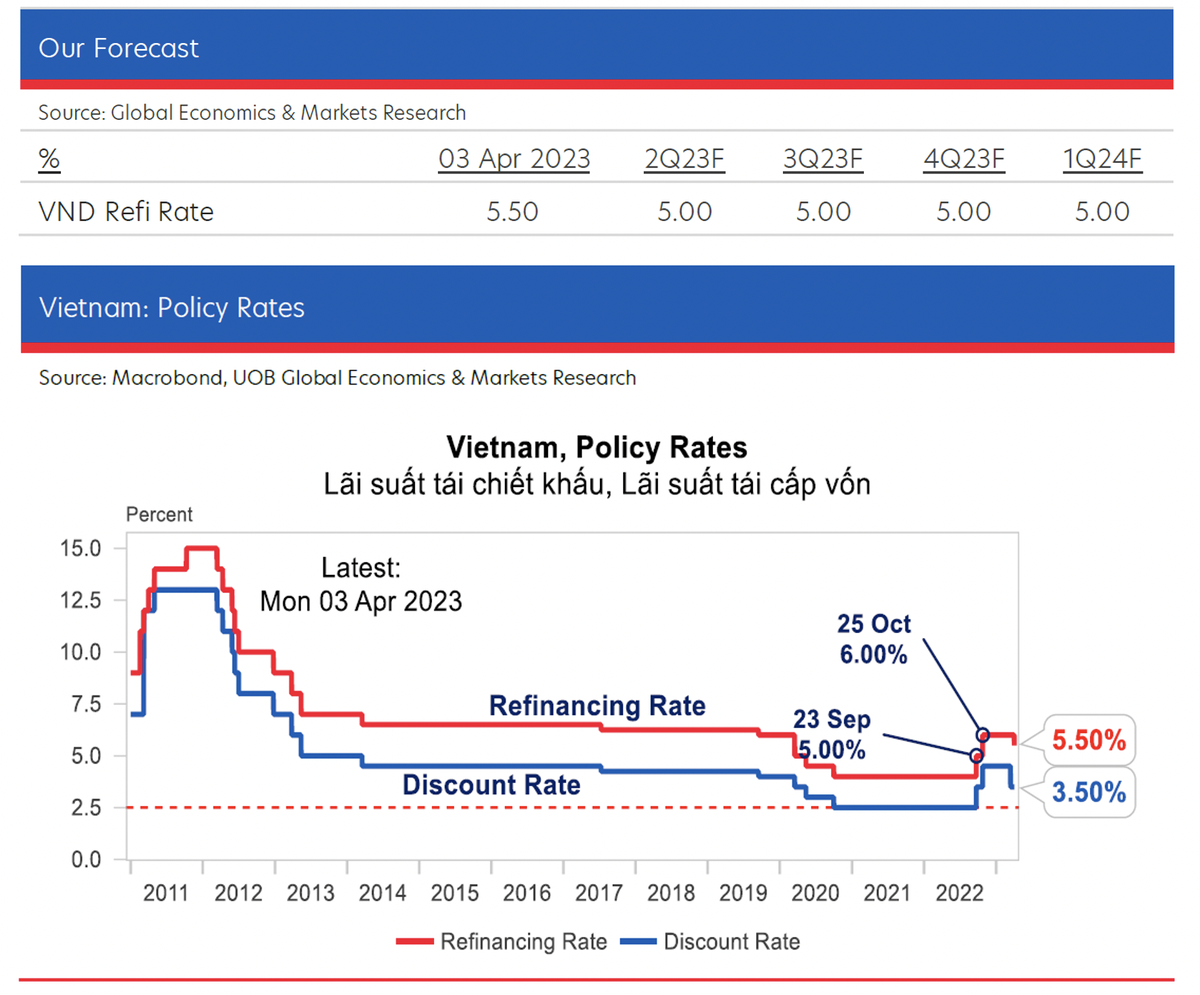 Bao gồm cả việc cắt giảm 50 điểm cơ bản mới được thông báo gần đây, UOB tiếp tục cho rằng NHNN có thể giảm tổng cộng 100 điểm cơ bản trong quý II/2023. Điều này có nghĩa là lãi suất tái cấp vốn rất có thể sẽ giảm thêm 50 điểm cơ bản trước thời điểm cuối tháng 6 để hỗ trợ cho các hoạt động kinh tế trong nước.