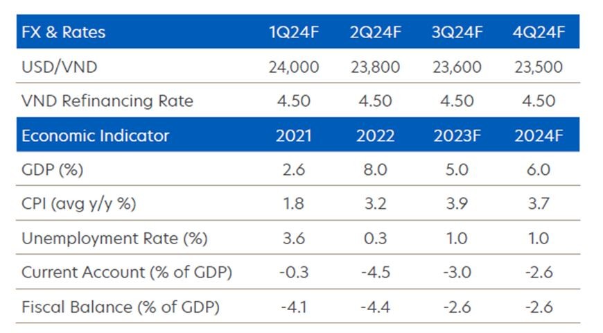 Nhìn chung, dự báo USD/VND cập nhật của UOB là 24.000 trong quý I/2024, 23.800 trong quý II/2024, 23.600 trong quý III/2024 và 23.500 trong quý IV/2024.