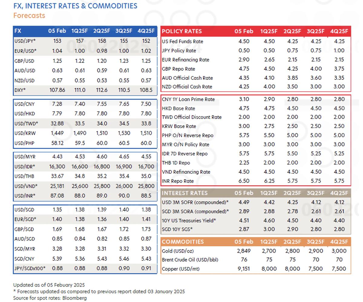 Dựa trên những giả định này, UOB duy trì kịch bản cơ sở rằng tăng trưởng GDP của Mỹ sẽ chậm lại ở mức 1,8% trong năm 2025, trong khi lạm phát CPI sẽ tăng thêm 0,4 điểm phần trăm lên 2,5%. Đồng thời, tăng trưởng GDP của Trung Quốc dự kiến sẽ giảm xuống còn 4,3%. Tuy nhiên, rủi ro đối với nền kinh tế toàn cầu và thị trường tài chính không dừng lại ở đó. Ngày càng có nguy cơ rõ ràng rằng Tổng thống Hoa Kỳ Trump có thể áp thuế đối với Liên minh châu Âu hoặc một lần nữa gia tăng các mối đe dọa thuế quan đối với các đối tác thương mại quan trọng như Canada, Mexico và Trung Quốc. Trong kịch bản tồi tệ nhất, ông có thể áp dụng mức thuế toàn diện lên tất cả hàng nhập khẩu vào Mỹ.