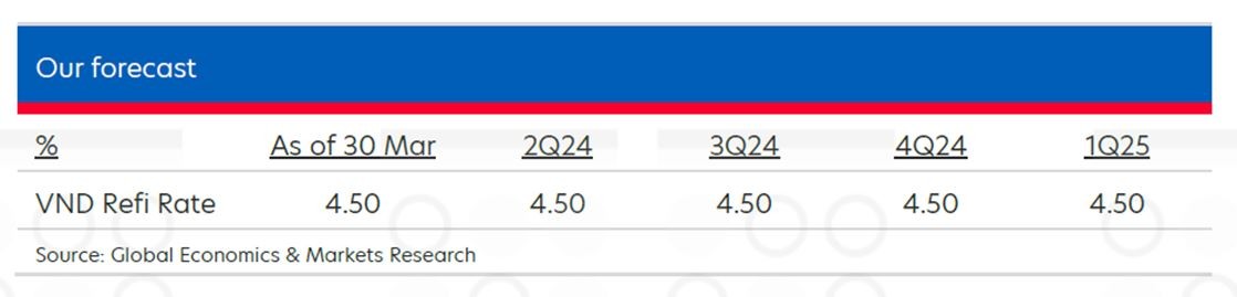 Cũng theo UOB, tỷ lệ lạm phát tăng nhanh gần đây có thể khiến NHNN thận trọng hơn nữa trong bất kỳ thay đổi nào về lãi suất chính sách. Vì vậy, UOB cho rằng NHNN sẽ duy trì lãi suất tái cấp vốn ở mức hiện tại là 4,50%. Thay vì tiếp tục hạ lãi suất với các hạn chế trong tính toán mức chặn dưới, Chính phủ đã chuyển trọng tâm sang các biện pháp phi lãi suất để hỗ trợ nền kinh tế.