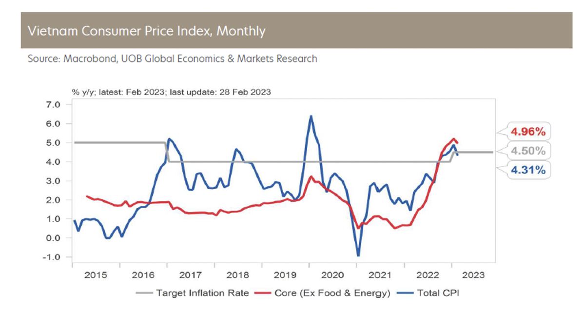 "Đầu tư trực tiếp nước ngoài (FDI) cũng đang cho thấy dấu hiệu trì trệ vào đầu năm 2023, với dòng vốn FDI thực tế ghi nhận từ đầu năm đến nay là 2,6 tỷ USD vào tháng 2, giảm so với mức 2,7 tỷ USD được ghi nhận trong cùng kỳ năm trước", chuyên gia UOB nhận định.