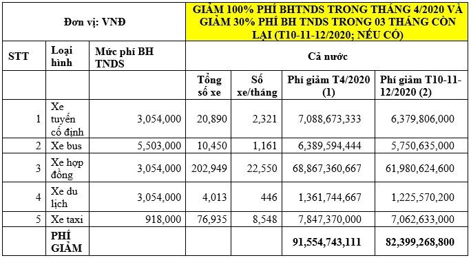 Đồng thời, với phương án giảm của Hiệp hội ô tô (như đề cập ở trên) thì theo ước tính của Công ty cổ phần Tư vấn dịch vụ bảo hiểm Việt Nam, tổng số tiền phí bảo hiểm trách nhiệm dân sự chủ xe ô tô mà các công ty bảo hiểm phải giảm sẽ dao động từ 100 tỷ đồng đến hơn 182 tỷ đồng tùy theo tình hình dịch bệnh, theo từng loài xe, tùy tỉnh bị dịch, số lượng xe cụ thể (xem bảng).