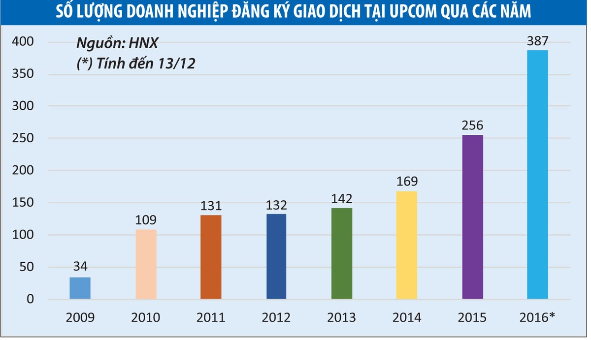 Tính đến cuối tháng 11/2016, UPCoM có 377 doanh nghiệp đăng ký giao dịch, với tổng giá trị đăng ký giao dịch 116.451 tỷ đồng, vốn hóa đạt 253.395 tỷ đồng, gấp 1,7 lần vốn hóa thị trường niêm yết HNX (145.000 tỷ đồng). Tháng 12, thống kê mới nhất tại HNX, đã có khoảng 30 doanh nghiệp được chấp thuận lên UPCoM, giúp UPCoM gần như chắc chắn đến mức 400 doanh nghiệp trong năm nay.
