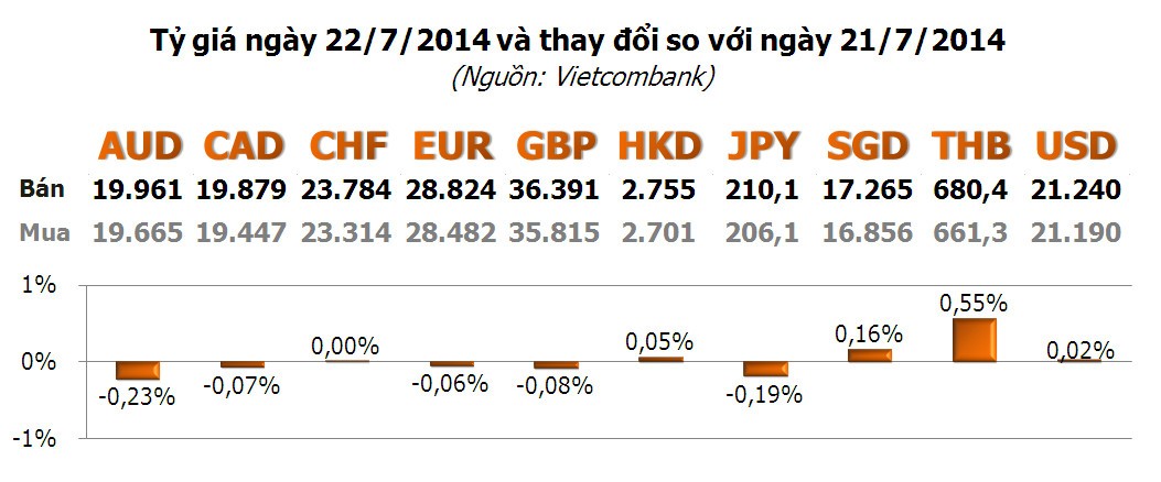 Với các ngoại tệ khác, ngoại trừ THB tăng 0,55%, các đồng tiền còn lại đều tăng/giảm không đáng kể (từ 0,23% trở xuống).