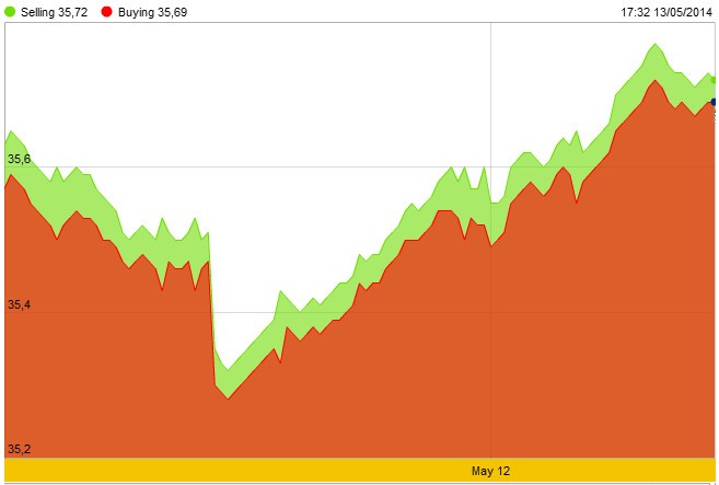 Tại thị trường trong nước, cùng với USD trên thị trường tự do, giá vàng tiếp tục tăng trong ngày buổi sáng hôm nay lên 35,72 - 35,77 triệu đồng/lượng, cao nhất kể từ 15/4. Tuy nhiên, từ đây, giá giảm trở lại, đến cuối giờ chiều qua còn 35,69 - 35,72, cao hơn 60.000 đồng/lượng so với chiều qua.