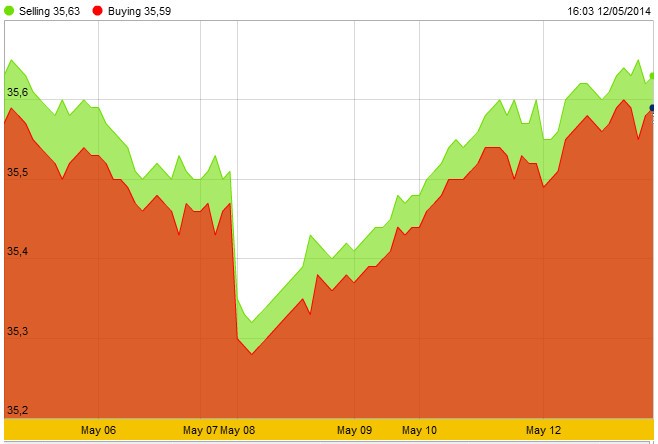 Tại thị trường trong nước, giá vàng SJC đầu giờ sáng giảm nhưng sau đó tăng, chủ yếu do giá USD trên thị trường tự do tăng lên mức cao trong vòng 1,5 tháng. Tính đến 4h30 chiều nay, giá vàng thương hiệu quốc gia ở mức 35,59 - 35,63 triệu đồng/lượng, tăng 70.000 đồng/lượng ở giá mua, 30.000 đồng/lượng ở giá bán so với cuối tuần trước.