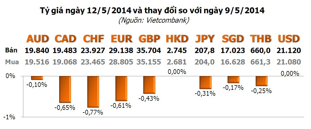 Với các ngoại tệ khác, hầu hết giảm giá, trong đó, CHF dẫn đầu với -0,77%; tiếp theo là CAD với -0,65%; EUR với -0,61%.