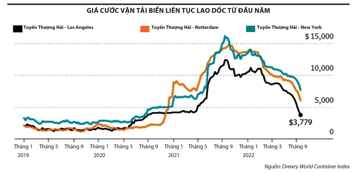 Theo dữ liệu từ Drewry, cước phí vận chuyển một container 40 feet từ cảng Thượng Hải đến Los Angeles là 3.779 USD vào tuần kết thúc ngày 23/9, đây là lần đầu tiên mức giá giao ngay dưới 4.000 USD kể từ tháng 9/2020 và chỉ bằng một nửa so với 3 tháng trước. Drewry cho biết, sẽ có nhiều sự sụt giảm hơn đối với cước phí vận tải trong vài tuần tới.