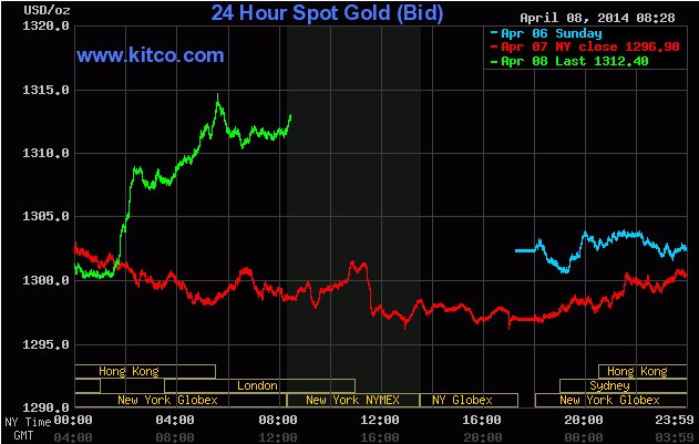 Giá vàng giao ngay tăng 1,1% lên 1.311,61 USD/ounce vào lúc 5h sáng, theo giờ New York. Trong quý đầu năm nay, giá vàng giao ngay bình quân là 1.292,15 USD/ounce.