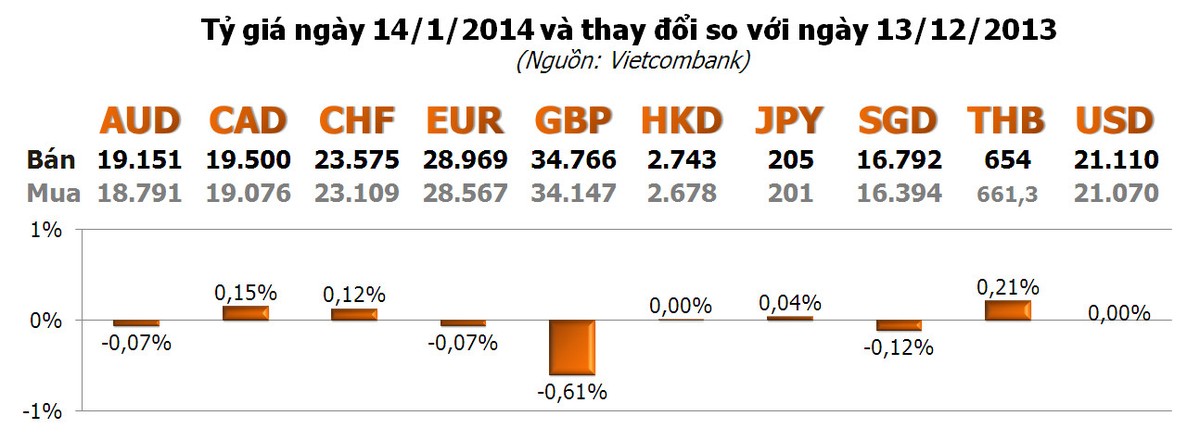 Hầu hết ngoại tệ khác đều tăng/giảm không đáng kể trong ngày hôm nay, ngoại trừ GBP. Đồng tiền của Anh giảm 0,61% so với ngày hôm qua. Các đồng tiền khác biết động từ 0,21% trở xuống.