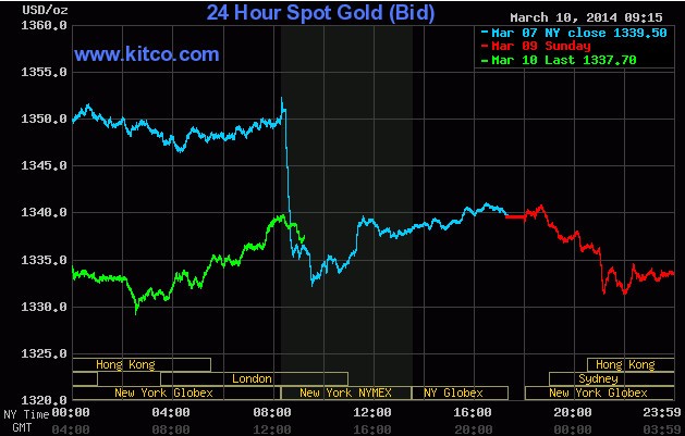 Giá vàng giao ngay thấp nhất trong ngày hôm nay là 1.330 USD/ounce, vào lúc 2h30 chiều, theo giờ Việt Nam. Từ đây, giá tăng lại và đến 8h tối đạt lại 1.338,1 USD/ounce, xấp xỉ mức cuối tuần trước. Giá giảm khiến cầu tăng là một trong những nhân tố giúp vàng lấy lại mức giá của cuối tuần trước.