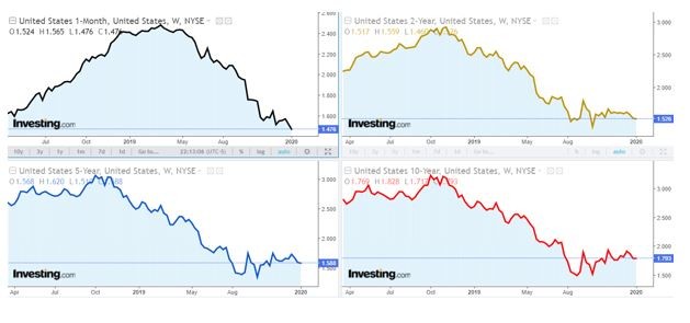Quan sát diễn biến giai đoạn cuối năm, thị trường trái phiếu Mỹ có hồi phục lại khá nhiều kể từ tháng 8/2019 khi có tín hiệu từ thỏa thuận thương mại Mỹ Trung có tiến triển, sự hồi phục diễn ra ở nhiều kỳ hạn từ 1, 2, 5 tới 10 năm, đặc biệt là kỳ hạn dài 5 và 10, lợi tức kỳ hạn 5 năm hồi phục từ 1,334% lên 1,764%, kỳ hạn 10 năm hồi phục từ 1,527% lên 1,923%.