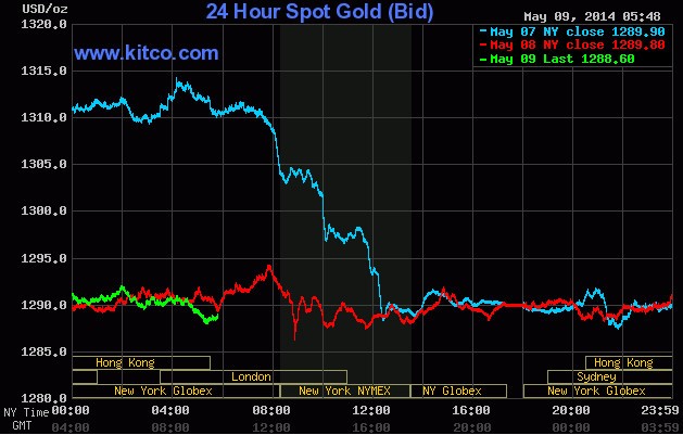 Giá vàng giao ngày đã tăng nhẹ 0,1% lên 1.291,06 USD/ounce lúc 9h31 sáng nay trên sàn Londong. Giá vàng giao tháng 6 đã tăng 0,3% lên 1.291 USD/ounce trên sàn Comex, New York.