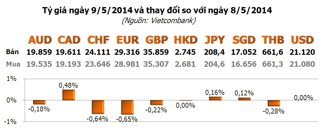 Các ngoại tệ khác, đa số giảm, dẫn đầu là EUR với -0,65%; tiếp theo là CHF với -0,64%... Ở chiều tăng, dẫn đầu là CAD với 0,48%; còn lại tăng, giảm không đáng kể.