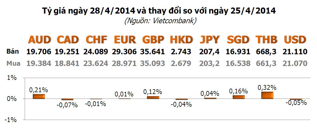 Với các ngoại tệ khác, xu hướng giảm mạnh hơn tăng với AUD giảm 0,58%, THB giảm 0,56% và SGD giảm 0,46%. Các ngoại tệ còn lại tăng/giảm từ 0,20% trở xuống.