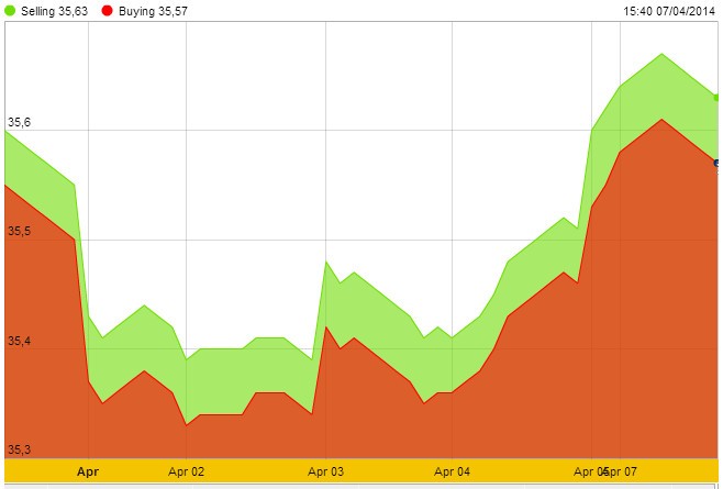 Tại thị trường trong nước, giá vàng SJC tăng đầu ngày hôm nay, 7/4, sau đó giảm trở lại. Mức cao nhất mà giá vàng thương hiệu quốc gia đạt được là 35,61 - 35,67 triệu đồng/lượng. Đến 5h30, giá giảm còn 35,57 - 35,63 triệu đồng/lượng, chỉ cao hơn giá cuối tuần trước 10.000 đồng/lượng.
