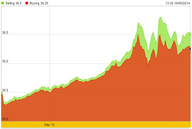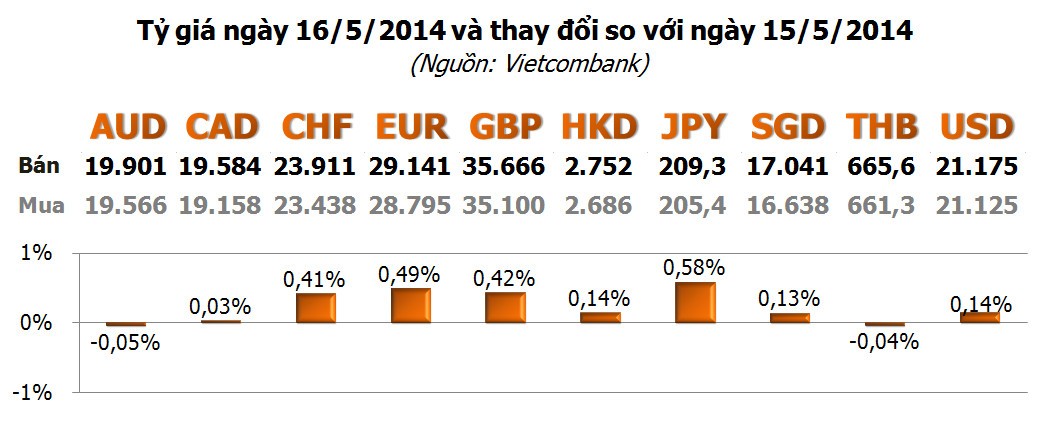Trong khi đó, giá USD do Vietcombank niêm yết tăng mạnh 25 đồng ở giá mua, 35 đồng ở giá bán lên 21.125 - 21.175 đồng/USD, cao nhất kể từ 7/9/2013.