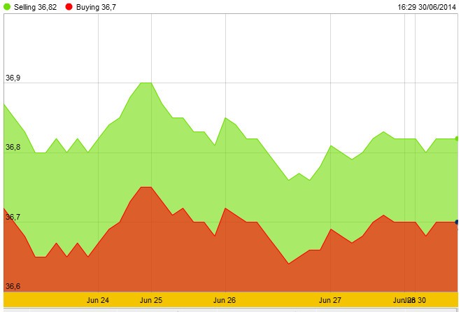 Tại thị trường trong nước, giá vàng SJC hôm nay hoàn toàn không có biến động nào nếu không kể đến cú giảm nhẹ 20.000 đồng/USD lúc 8h30 sáng, nhưng tăng lại ngay và duy trì đến cuối ngày mức của cuối tuần trước, 36,70 - 36,82 USD/ounce.