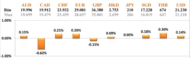 Cụ thể, cặp EUR/USD giảm 0,06%, xuống 1,3611, cặp GBP/USD giảm 0,12%, xuống 1,7063, cặp USD/JPY tăng 0,04%, lên 101,57.