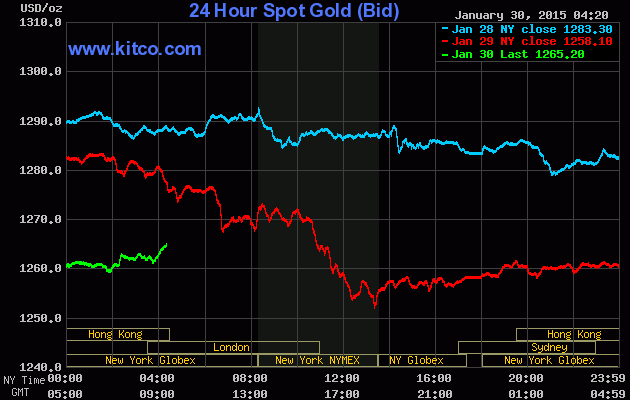 Sau khi thị trường New York chứng kiến mức giảm lớn nhất trong một ngày vào phiên tối qua (29/1) theo giờ Việt Nam, thị trường Hong Kong không xuất hiện nhiều biến động. Giá vàng giữ ở mức thấp và chủ yếu đi ngang quanh mức 1260,0 USD/ounce. Về cuối phiên, giá vàng tăng nhẹ và đóng cửa ở mức 1264,05 USD/ounce.
