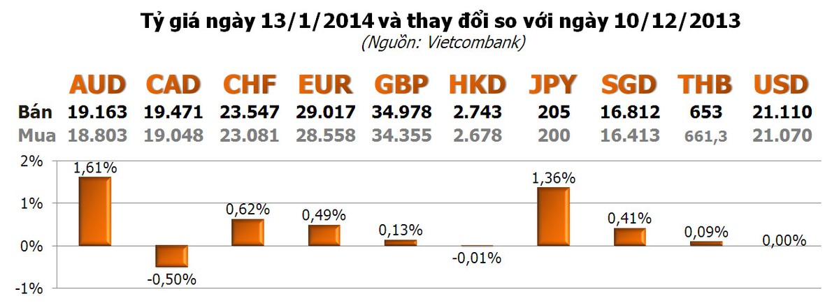 Với các ngoại tệ khác đa số tăng trở lại do đồng USD yếu đi trên thị trường quốc tế. AUD là đồng tiền tăng mạnh nhất với 1,61%; tiếp đến là JPY, tăng 1,36%; CHF tăng 0,62%; EUR tăng 0,49%...