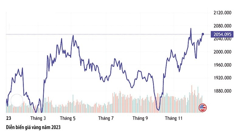 Trên thế giới, các nhà đầu tư chuyển sang nắm giữ vàng nhiều hơn sau khi Cục Dự trữ Liên bang Mỹ (Fed) phát đi những tín hiệu cho thấy, có thể cắt giảm lãi suất 3 lần vào năm 2024. Fed giảm lãi suất, đồng nghĩa USD suy yếu, từ đó hỗ trợ giá vàng. Ngoài ra, nhu cầu mua vàng vật chất tăng cao trên toàn thế giới để phục vụ nhu cầu lễ hội và tích trữ dịp cuối năm cũng là lý do khiến giá vàng tăng mạnh.