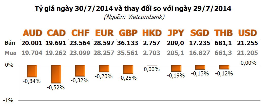 Các ngoại tệ khác đồng loạt giảm, trong đó CAD giảm mạnh nhất với -0,52%; tiếp theo là AUD với -0,34%; CHF với -0,32%...