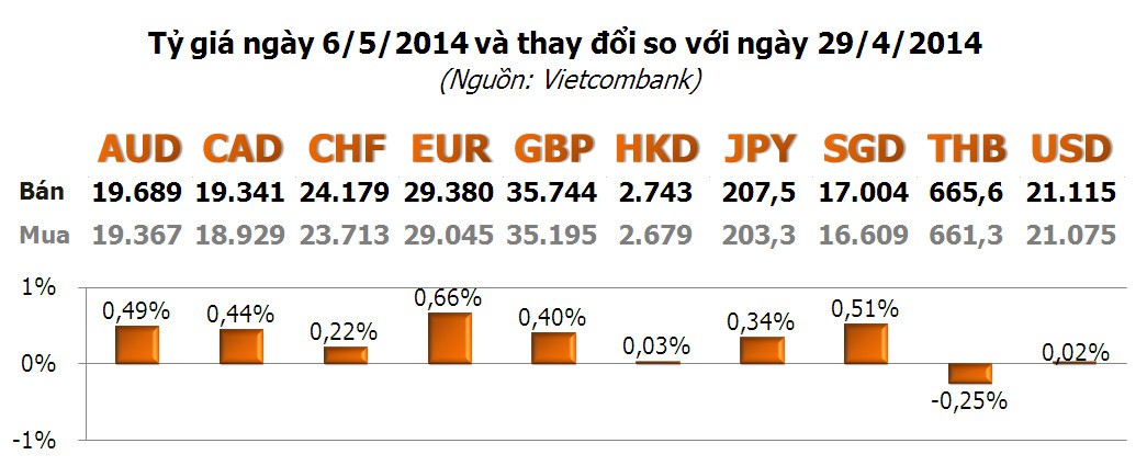 Giá USD tăng nhẹ trở lại sau kỳ nghỉ dài 30/4 - 1/5. Cụ thể, trên thị trường tự do, giá tăng 10 đồng ở cả giá mua và giá bán lên tương ứng 21.090 - 21.110 đồng/USD. Giá USD do Vietcombank niêm yết tăng 5 đồng ở cả giá mua và giá bán lên 21.075 - 21.115 đồng/USD.