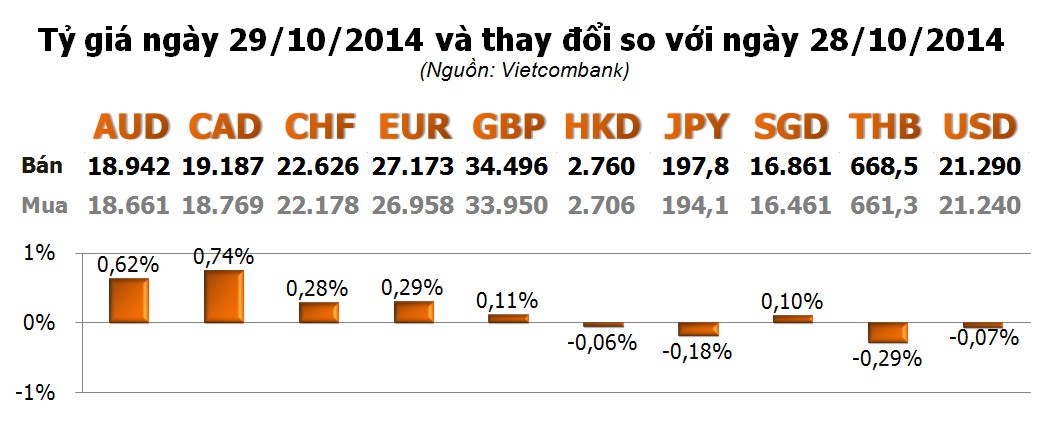 Các ngoại tệ khác vẫn hầu hết tăng, trong đó chủ yếu là các đồng tiền phương Tây. Dẫn đầu là CAD với 0,74%; tiếp theo là AUD với 0,62%; EUR với 0,29%...