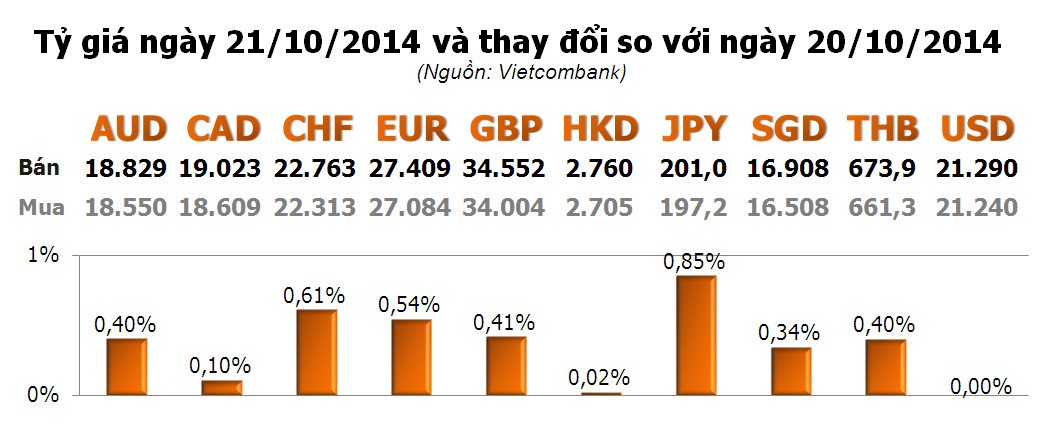 Với các ngoại tệ khác, 100% tăng giá, trong đó, tăng mạnh nhất là JPY với 0,85%; tiếp theo là CHF với 0,61%; GBP 0,54%...