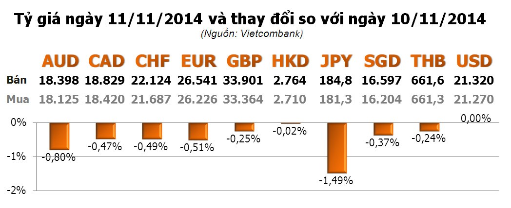 Các ngoại tệ khác, tất cả đều giảm. Trong đó, giảm mạnh nhất là JPY với -1,49%; tiếp theo là AUD với -0,80%; EUR với -0,51%; CHF với -0,49%...