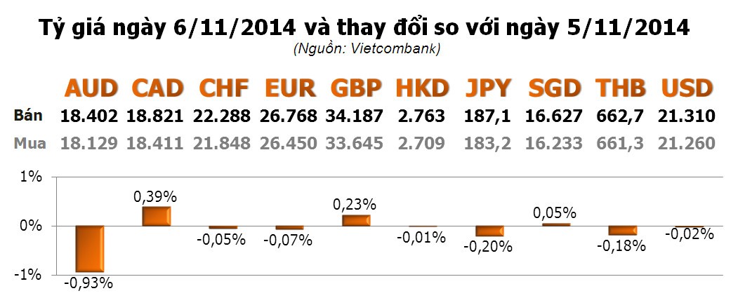Các ngoại tệ khác, ngoài AUD giảm mạnh với -0,93% và CAD tăng với 0,39% thì thay đổi không đáng kể.